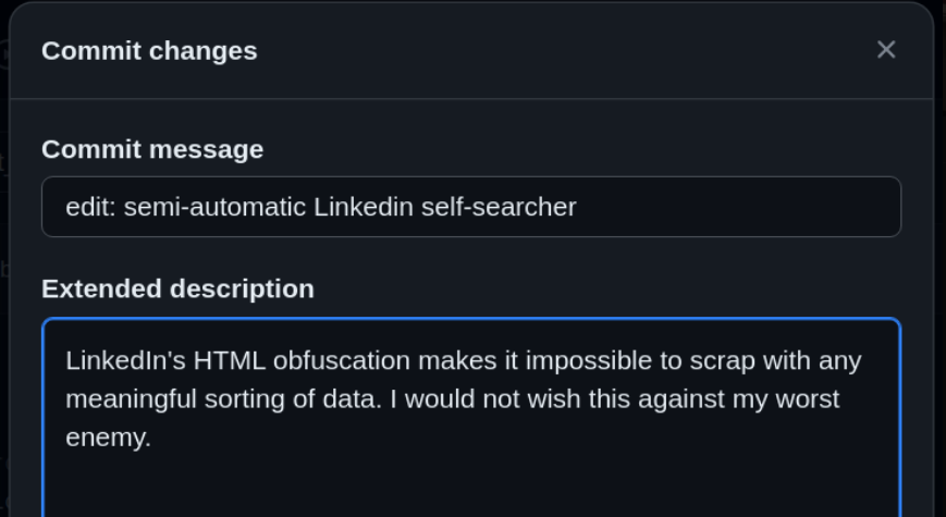 Unfortunately, I was unable to finish my LinkedIn scraper because of how difficult the task of actually parsing LinkedIn posts was, but at least I made some semi-automatic LinkedIn search via command-line. If you ever wanted to search something on LinkedIn without actually opening any page or opening a browser instance, you can run this code and it'll do the job! Here was my one (and only) commit message to my web-scraping group's GitHub repo: