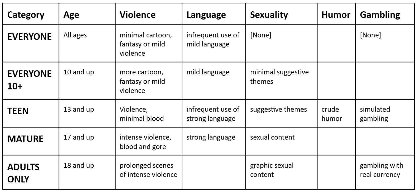 Above: Google description of age ratings, with the Entertainment Software Rating Board (ESRB) ratings guide recommendations in square brackets.