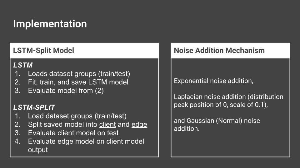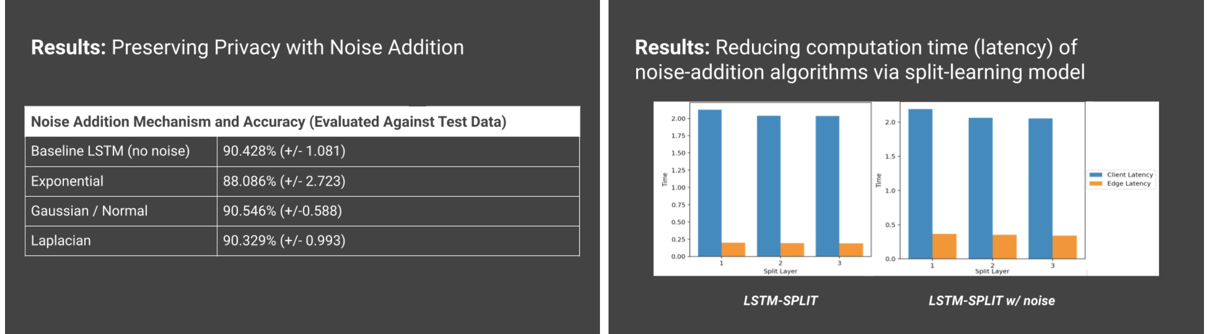 When resolving the two major problems that we had in our problem statement, it seemed like any of the noise addition methods I used (Gaussian, Random, etc.) would have approximately the same accuracy when evaluated after the model training on the data (~90%) and thus are relatively privacy-preserving. In regards to our other problem, we measured the latency and our LSTM-SPLIT model does not increase much with or without the noise addition. So, this noise addition method is an effective way to not increase computational overload on the IoT device.