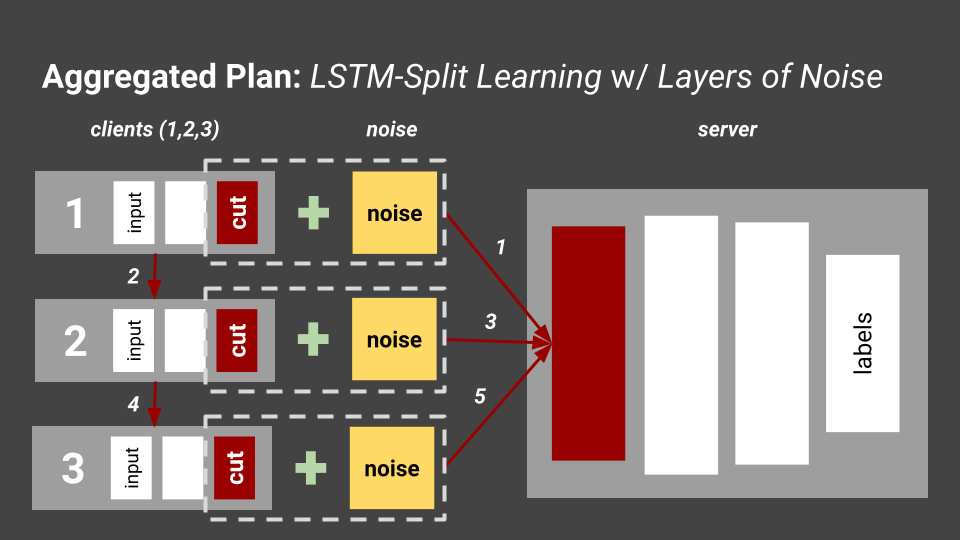 We ended up using tutorials like this one, and worked on incorporating the "split" portion into this existing tutorial. We also researched how to add different types of noise (i.e. LaPlacian, Gaussian...) to this LSTM tutorial. I found many different existing GitHub repositories that aimed to add specific types of noise we were looking for to ensure differential privacy. Our model essentially worked like this: