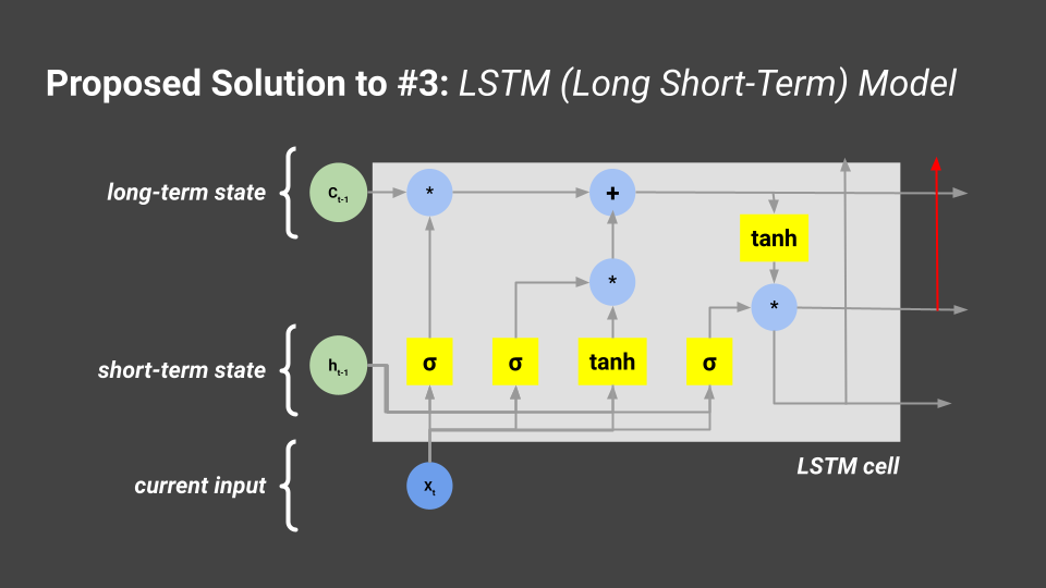We decided on implementing an LSTM model. LSTM stands for long-short term memory, which is a type of recurrent neural network (RNN) that is effective in processing time-series data. It deals with the vanishing and exploding gradient problem when training RNNs, and can process point data as well as sequential data without relation to points in previous steps.