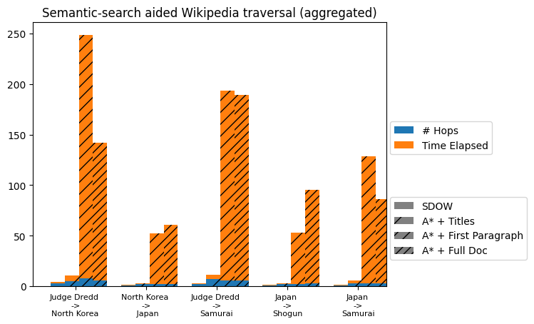Looking at the results, it's obvious that using titles is way faster than the first paragraph or full doc methods. It also seemed like, weirdly enough, the first paragraph and full doc methods interchangeably did worse/better across different types of searches we performed. This can probably be chalked up to decisions that DistilBERT makes during the search process. The number of hops that each method took is also about the same across all of them, which means that using just titles seems like a good enough method that is way faster than the other two to solve this sort of problem.
